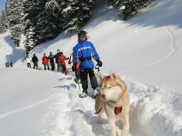 You hike on natural paths and mountain trails through the wild and romantic Muota Valley and enjoy the unique mountain scenery. You will also visit the beautifully developed husky enclosure and help feed the husky pack after the trek. In winter, the programme is also possible with snowshoes, followed by a fondue in our restaurant. Our huskies are looking forward to seeing you!