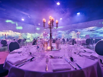 Are you still looking for an exciting location for this year's Christmas dinner? Discover a winter wonderland with our "Polar Night" package and stay nice and warm at the same time! Not only the 270° projection, but also the harmonious decorations will give you that winter feeling. The matching menu from Tavola Catering rounds off the winter atmosphere.