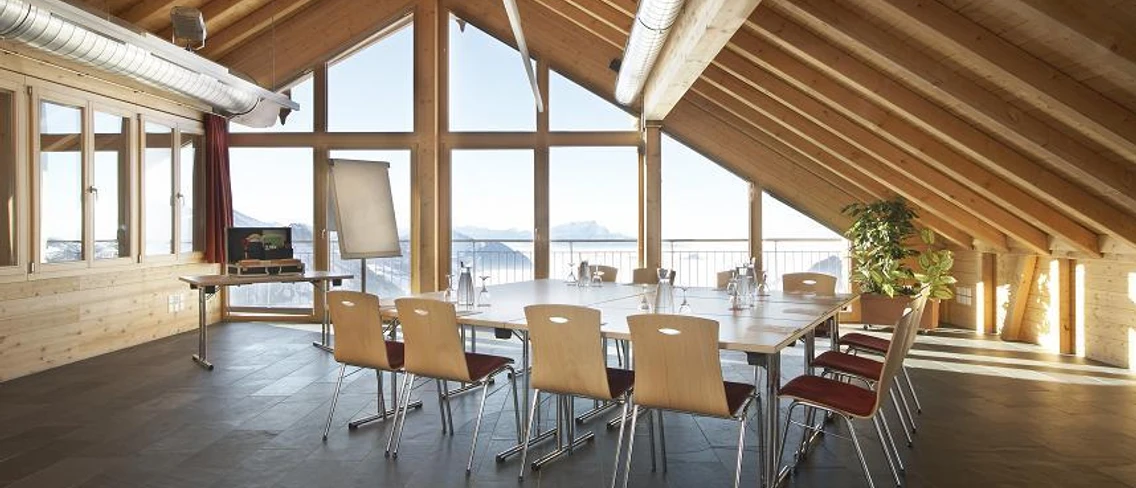 The large panoramic windows offer a fantastic view of up to ten lakes and countless Alpine peaks in Central Switzerland. The windows can easily be darkened if required. The Fronalpstock summit restaurant can be easily reached from Stoos by covered chairlift in just 15 minutes. In addition to the plenum, the location also offers overnight accommodation in double or multi-bed rooms.