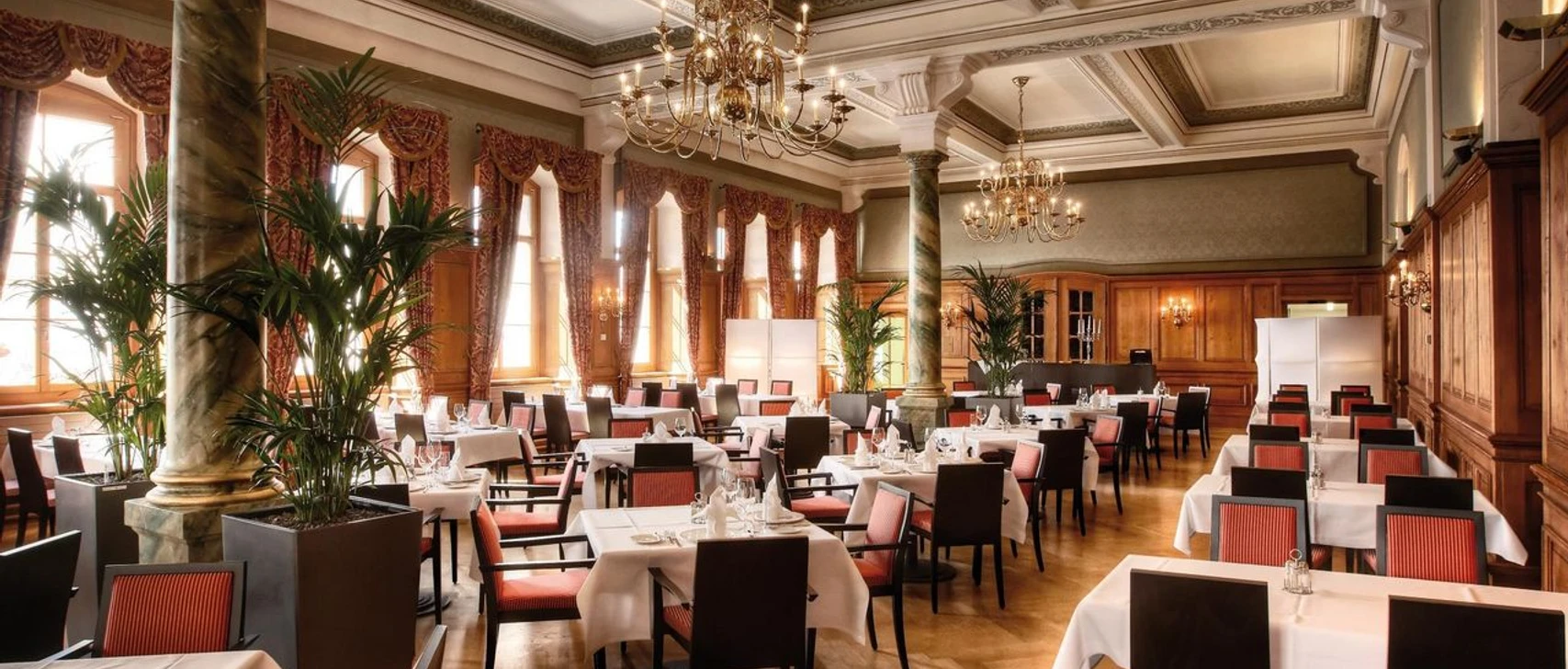 The highlight is the festive Queen Victoria Hall with its elegant stucco ceiling and magnificent chandeliers. The listed hall is dedicated to Queen Victoria of England, who visited Pilatus Kulm in 1868, and still offers a unique setting for banqueting events today.