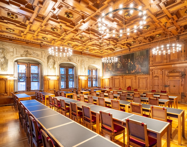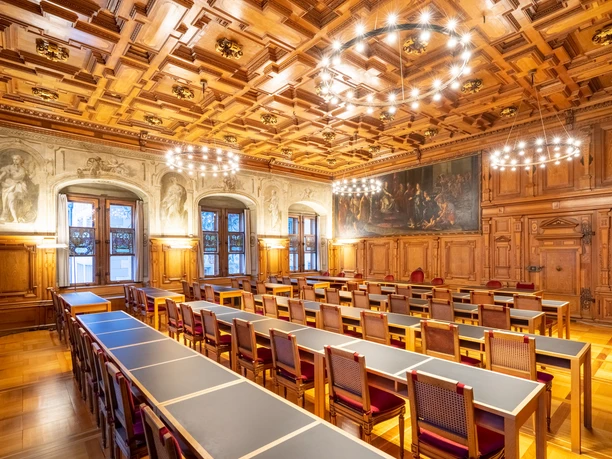 The town hall is located in the centre of Lucerne's old town, directly on the River Reuss. It is part of the city's property portfolio and was built between 1602 and 1606 in the Italian Renaissance style. The town hall is a federally listed building. The neighbouring Am Rhyn houses - built in the 17th century - are also among the most important town houses in Lucerne and are listed buildings. Individual rooms can be rented for various events, subject to the conditions of use. Most of the houses are wheelchair accessible